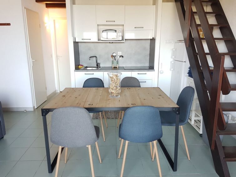 "T3 Costa D'Oru", 3-Zimmer-Maisonette-Wohnung 52 m2. Einfach und komfortabel eingerichtet: Wohn-/Esszimmer mit 1 Diwanbett (140 cm, Länge 190 cm), Esstisch und TV (Flachbildschirm), Klimaanlage. Ausgang zur Terrasse. 1 Zimmer mit 1 franz. Bett (140 cm, Länge 190 cm). Kochnische (2 Glaskeramikplatten, Wasserkocher, Mikrowelle, elektrische Kaffeemaschine). Bad, sep. WC. E-Heizung. Obergeschoss: 1 abgeschrägtes Zimmer mit 1 franz. Bett (140 cm, Länge 190 cm). Terrasse 10 m2. Terrassenmöbel. Sicht auf das Meer. Parkplatz beim Haus. Bitte beachten: Nichtraucher-Unterkunft. Rauchmelder. Inserat eines gewerblichen Vermieters nach Artikel 155, IV, CGI
