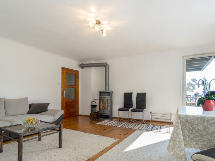 "Carla", 2-Zimmer-Wohnung 86 m2, im Erdgeschoss. Objekt geeignet für 4 Erwachsene + 2 Kinder. Schön und geschmackvoll eingerichtet: Wohn-/Esszimmer mit 1 Doppeldiwanbett (140 cm, Länge 200 cm), Schwedenofen und Esstisch. Ausgang zur Terrasse. 1 Doppelzimmer. Grosse Küche (Geschirrspüler, 4 Glaskeramikplatten, Toaster, Wasserkocher, Mikrowelle, Tiefkühler, elektrische Kaffeemaschine) mit Esstisch. Dusche/WC. Heizung. Parkettboden. Garten. Terrassenmöbel. Sehr schöne Sicht auf den See. Bitte beachten: Nichtraucher-Haus.