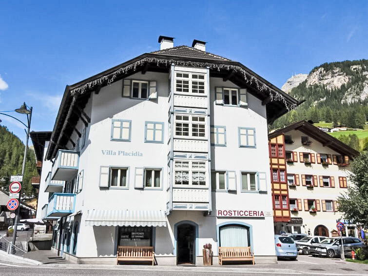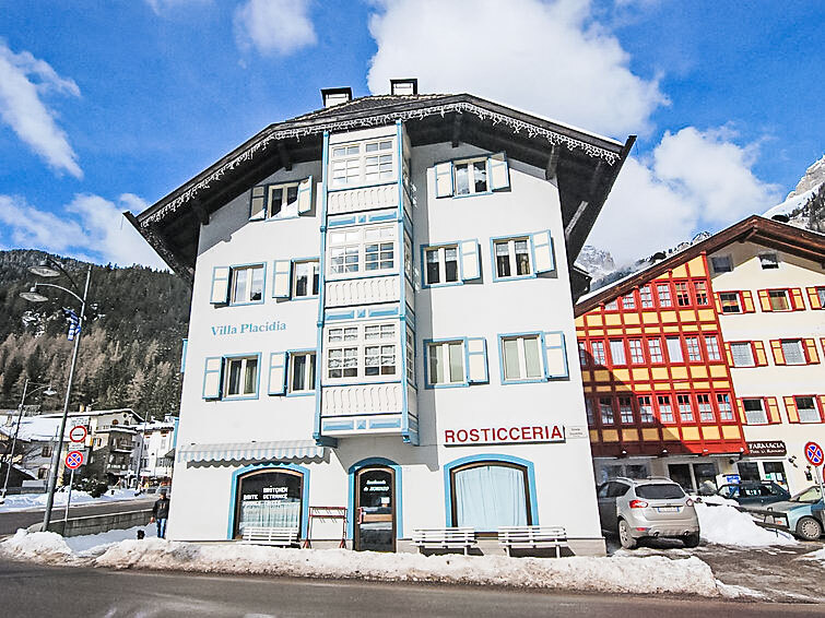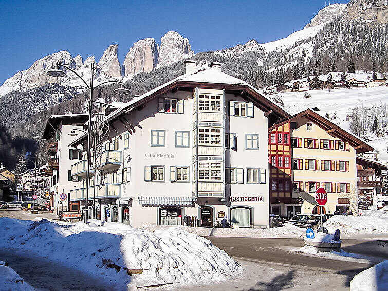 Mooi, comfortabel appartementencomplex "Villa Placidia", van 3 verdiepingen, gerenoveerd. 11 appartementen in de woning. In het centrum van Campitello, 2 km van het centrum van Canazei, drukke, zonnige ligging, 200 m van het skigebied, aan een hoofdweg, op het zuiden. In het huis: centrale verwarming, verwarming alleen beschikbaar van 01.Dec. - 01.Mei.. In de winter sneeuwkettingen aanbevolen. Openbare parkeerplaatsen 500 m extra. Levensmiddelenwinkel 200 m, supermarkt 500 m, restaurant, bar 200 m, bushalte 20 m. Stoeltjeslift 200 m, skibushalte 20 m. Attracties in de buurt: Sella Ronda 400 m, Lago di Carezza 21 km.