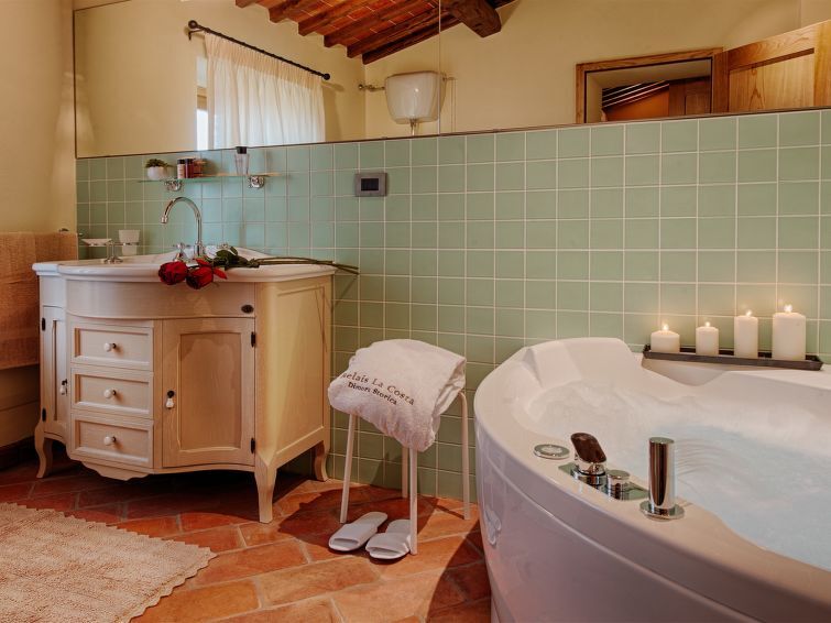 "Relais La Costa", 22-kamers cottage 700 m2 op 3 verdiepingen. Ruim, volledig gerenoveerd, smaakvol en stijlvol ingericht: groot woonkamer met open haard en TV (Flatscreen TV), air-conditioning. Uitgang naar de zitplaats in de tuin. Woonkamer met TV (Flatscreen TV), air-conditioning. Uitgang naar de zitplaats in de tuin. Eetkamer met open haard en TV (Flatscreen TV), air-conditioning. Uitgang naar de zitplaats in de tuin. Woonkamer met TV (Flatscreen TV), air-conditioning. Uitgang naar de zitplaats in de tuin. 4 2-pers. kamers, elke kamer heeft air-conditioning. Keuken (oven, afwasmachine, Gasfornuis, 4 kookpitten (vlammen), broodrooster, waterkoker, magnetron, elektrische koffiemachine). 5 douche/bidet/WC's. Souterrain: 3 douches, 2 aparte WC's, hydro massage bad, Sauna. Bovenverdieping: (steile trap). Woonkamer met 1 2-pers divanbed en TV (Flatscreen TV), air-conditioning. Open galerij met 1 2-pers divanbed. 2 2-pers. kamers, elke kamer heeft douche/bidet/WC en air-conditioning. 4 2-pers. kamers, elke kamer heeft air-conditioning. 4 douche/bidet/WC's. Gas-verwarming, air-conditioning. Natuurstenen vloeren. 2 terrassen, zithoek in de tuin. Terrasmeubelen, barbecue, ligstoelen, loggia, bergruimte. Mooi panoramazicht op het landschap en Siena. Ter beschikking: wasmachine, droger, kinderstoel, kinderbed tot 2 jaar, haardroger. Internet (Internet (WiFi), gratis). Parkeerplaats (omheind). Niet rokers woning. Rookmelders, brandblusser. Geen interne verbinding tussen de aparte wooneenheden. Geen interne verbinding tussen de etages. Het zwembad genoemd in de beschrijving is voor privé gebruik. IT052016B9IXL2R6T4